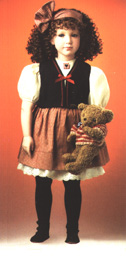 Her ecru colored petticoat and bloomers are hand-embroidered. She is wearing full size golden hoop earrings and custom-fitted black Danskin® tights. Her shoes are made from the richest Malabar suede leather, with three hand-burnished leather straps, and adorable antique style buttons with full machine-stitched working buttonholes. Her deep set chestnut brown eyelashes gently frame her mystical indigo blue, hand set glass eyes for an effect this is simply breathtaking. World Quality Handcrafted in California. |