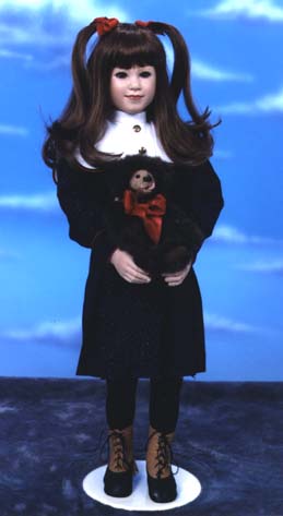 Black Danskin® tights. Rich two-toned brown boots of Malabar suede with the softest black goat-skin leather with adorable full leather working tongue, gold eyelets, black self-tie and 100% leather sole. Comes with an adorable 12" fully jointed, limited edition brown plush teddy bear with hand sculpted resin face designed by Kimberly Hunt. Bear individually hand numbered on leather tush tag at back. World Class Quality Handcrafted in California. |