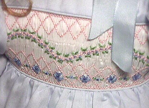 Rich hand-embroidered and hand-smocked cotton dress with delicate pink and blue garland design. Antique-style hand crocheted cotton socks and hand embroidered shoes. Exquisite Steamer Trunk. GADCO's "Bear Cub"TM and Authenticated Royal Relic TM included.