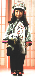 Trimmed with genuine antique style gold galloon, She is wearing an elaborate hand beaded satin headpiece designed with French silk pom-poms and rich hand sewn and hand painted multi-colored glass beads. Matching handmade Chinese style slip-on shoes with matching soft pink pom-poms and with antique style gold galloon. Her deep ebony-brown glass eyes are hand set and carefully accented by lifelike individually hand set eyelashes. China Pearl carries a lucky piece of history in her pocket, an authentic Chinese coin from China's glorious ancient past. Yet with all her elegance and pomp, she is not too regal to hold tightly to her own pet 12" mink-look plush Panda bear. World Class Quality Handcrafted in California. |