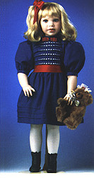Red and navy satin bows accent her dress top and finishes off this amazing stunner. Her legs are covered by white Danskin® shimmering tights. She wears navy blue antique style boots made with 100% natural goatskin leather and leather soles including five side buttons with full working button holes. She comes complete with a 12" limited edition, fully jointed, honey brown, plush teddy bear with adorable hand sculpted resin face designed by Kimberly Hunt. Bear is individually hand numbered on leather tush tag at back. An American Masterpiece. |