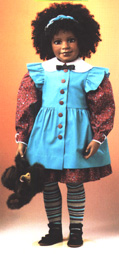 French bretelles (exquisite shoulder ruffle) crown the puffed sleeves. Extraordinary multicolored striped stockings in oatmeal heather, barn red, ink blue, burgundy, plum wine, olive and surf turquoise. Adorable matching soft turquoise and white braided bandeau in her hair. Rich Malabar suede leather shoes with three hand burnished leather straps and adorable round black buttons with full machine stitched working buttonholes. Comes complete with a 12" fully jointed, limited edition, brown plush teddy bear with an adorable hand sculpted resin face designed by Kimberly Hunt. Bear is individually hand numbered on leather tush tag on back. World Class Quality Handcrafted in California. |