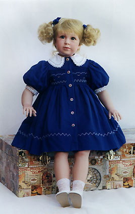 CLASSIC FRENCH-STYLE CLOTHES Her dress is a beautiful royal blue 100% Cotton hand smocked and hand embroidered French-style toddler dress circa the 1930's. The colors of embroidery threads are made up of subtle blues, greens and pinks in delicate flower and leaf designs. It was designed exclusively for The Great American Doll Company by that well known designer, Eileen Fitzgerald Smith. Tabitha's undergarments include a full petticoat, bloomers, and GADCO's own standard insertion ribbon interwoven inside the lace on her bloomers and fashionable slip. She is wearing expensive antique-style hand crocheted socks and specially designed all white T-Strap style shoes with full golden buckles that attaches at the side.